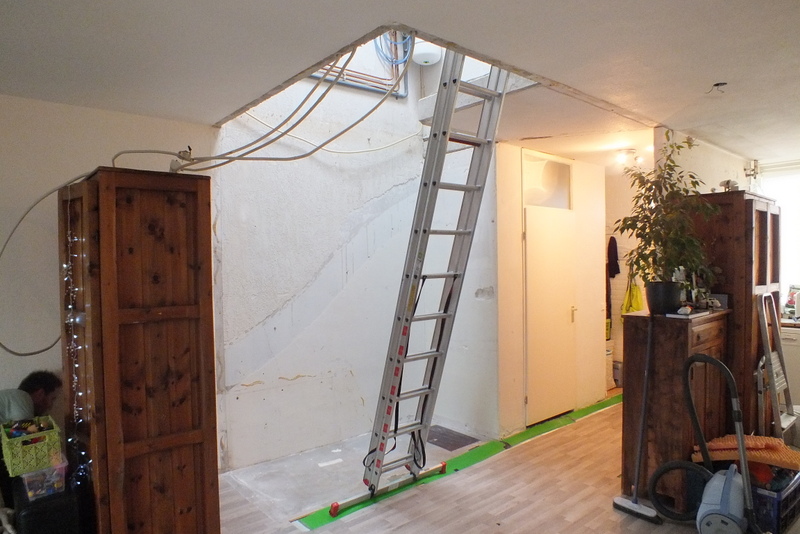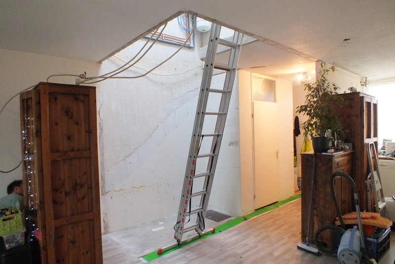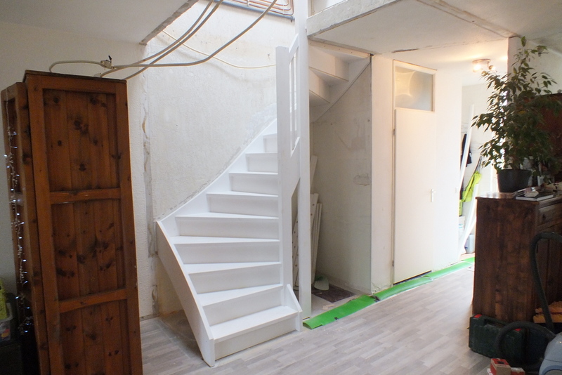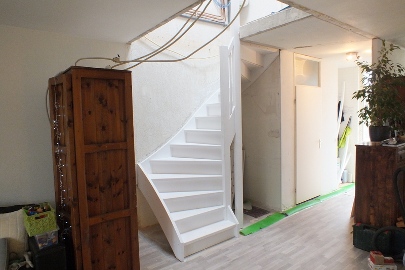 Om te voorkomen dat deze mensen dus géén gebruik van de 1e verdieping konden maken is z.s.m. na het verwijderen van de bestaande trap deze nieuwe door ons ingemeten en gemaakte gesloten trap in een tijdsbestek van 2 uur geplaatst .