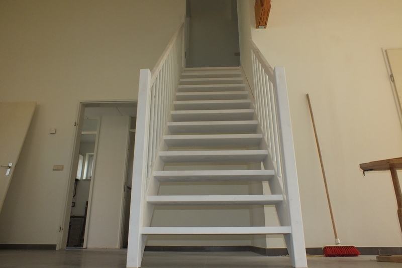 Deze open steektrap in Roosendaal is door ons 1 x gegrond en het hekwerk op de trap is ook door ons geplaatst.