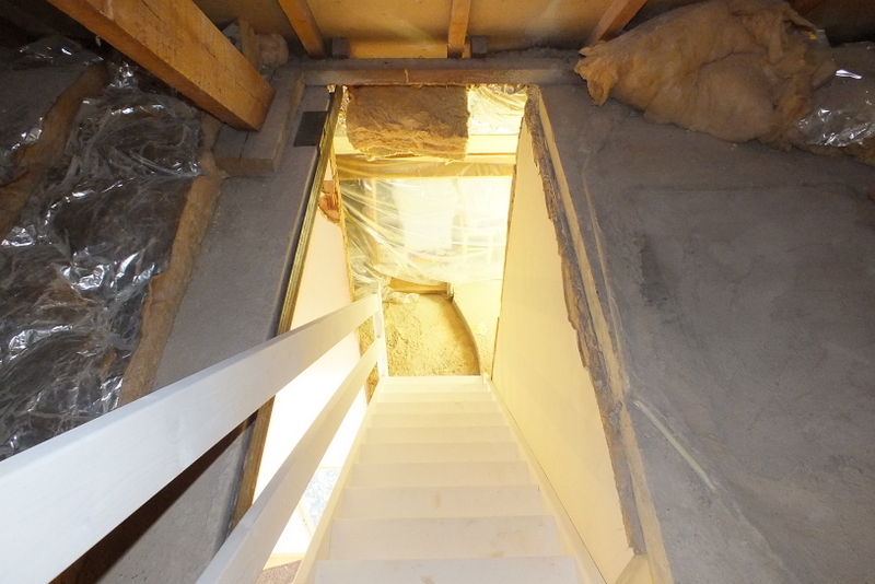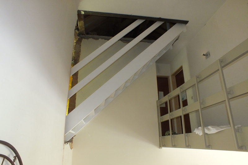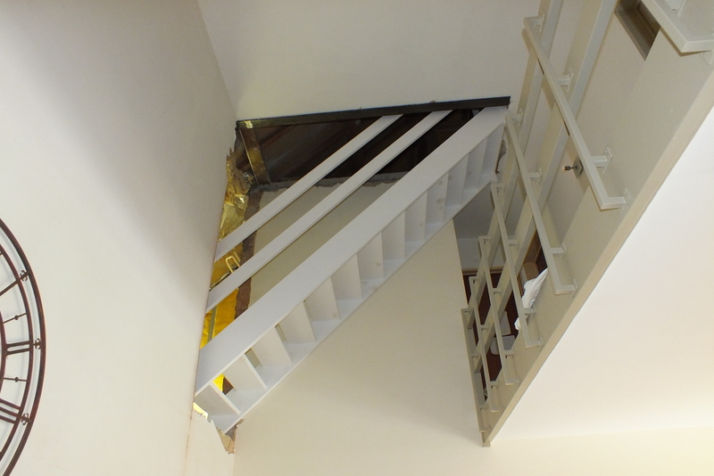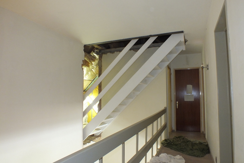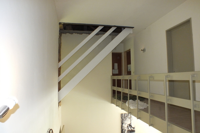 Wederom een redelijk pittig karwei: er moest een trapgat in een betonnen vloer worden gemaakt, tevens een trapopening in een muur en dit geheel moest constructief goed opgevangen worden.