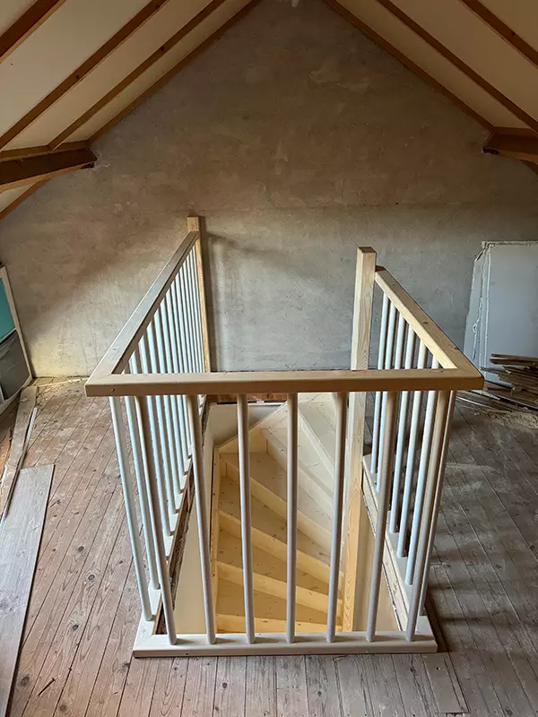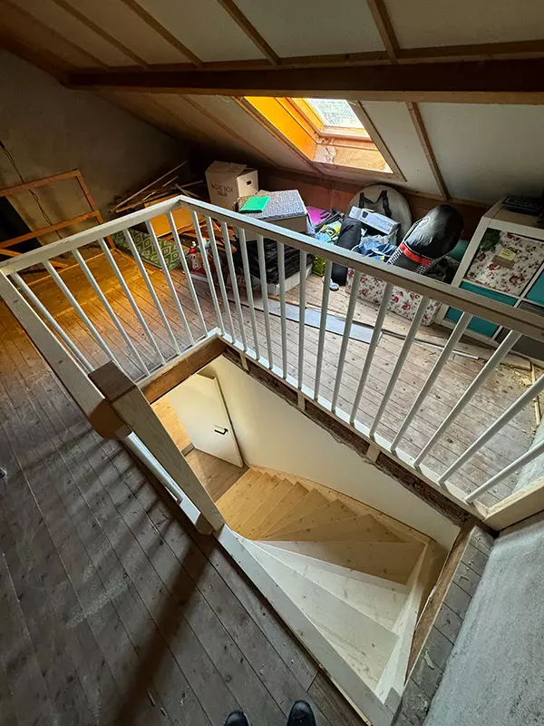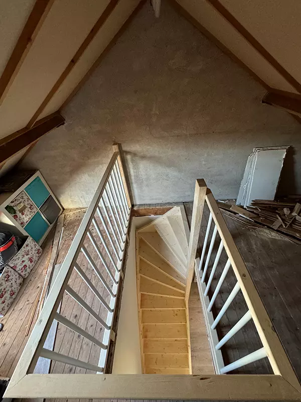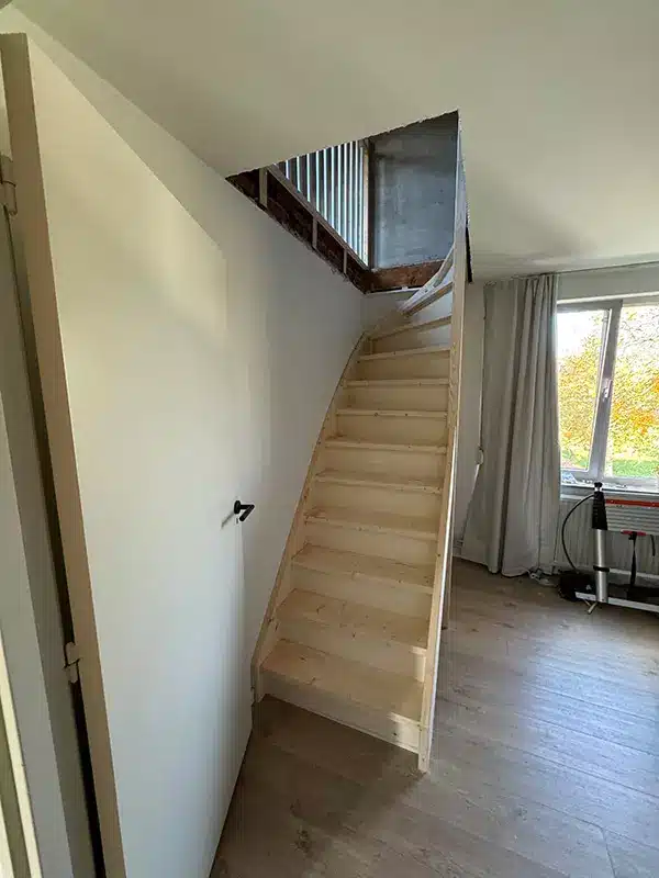 Trapgat houten vloer dichte trap met hekwerk op zolder in Reuver