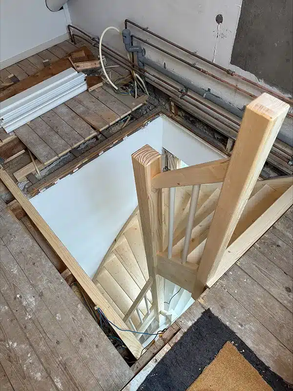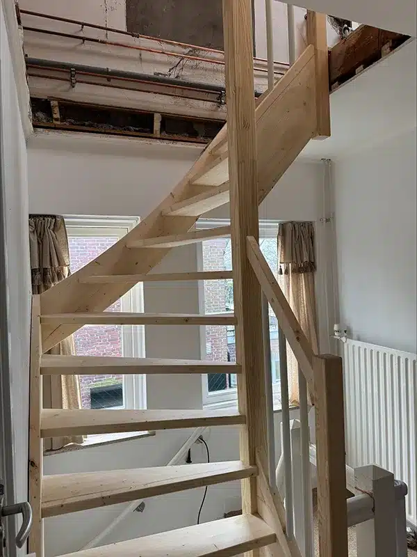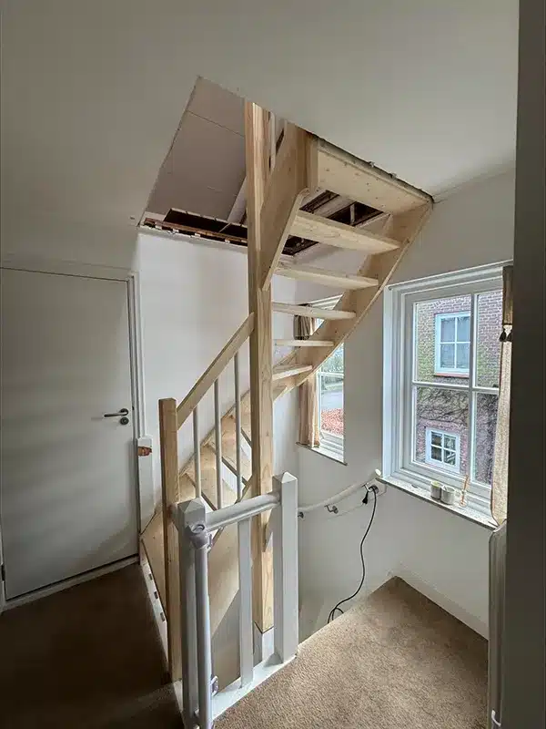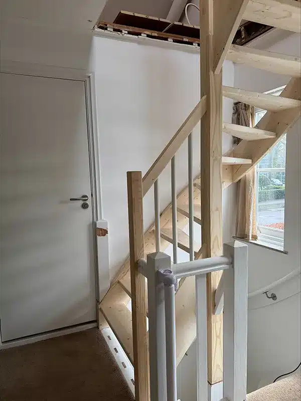 Open hoektrap met hekwerk op de trap + trapgat in houten vloer Tilburg