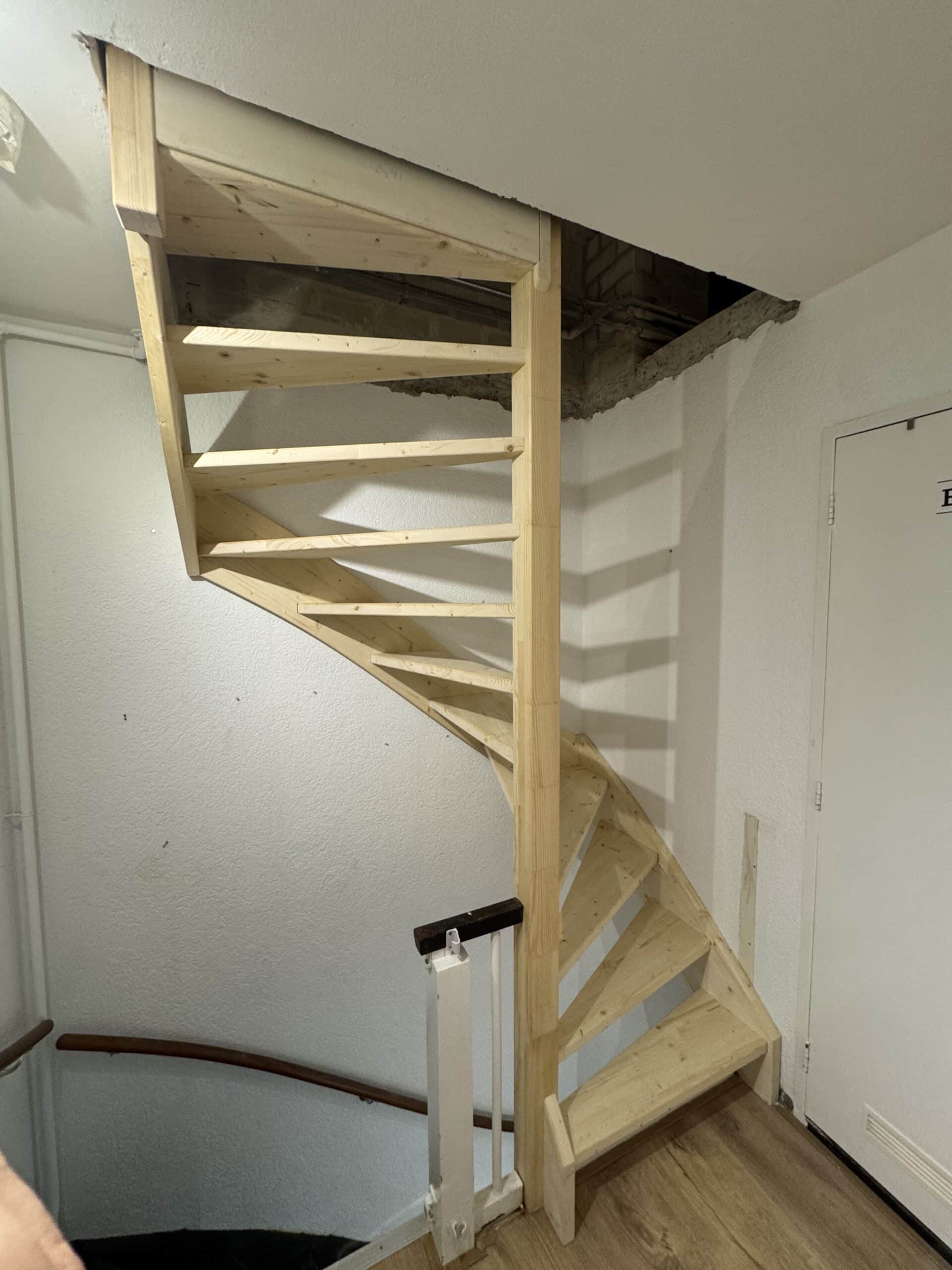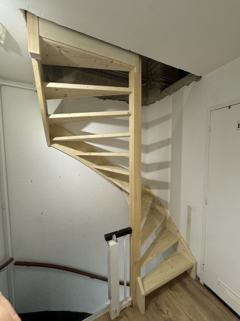Voor dit project in Eindhoven hebben we een trapgat gemaakt in een betonnen vloer en een vaste houten trap naar zolder geplaatst. De trap is compact uitgevoerd, met een comfortabele draai en een open uitstraling. Het trapgat is vakkundig aangebracht en netjes afgewerkt, waardoor de zolder veilig en praktisch bereikbaar is geworden.