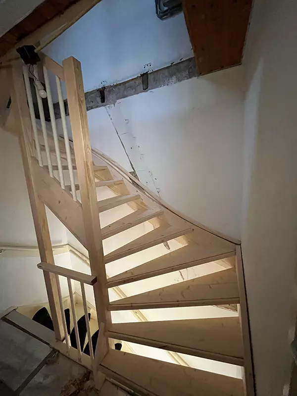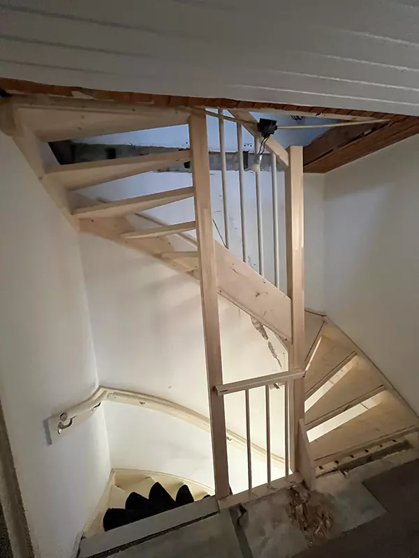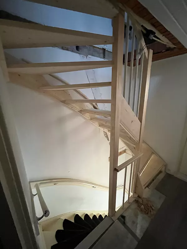 Trapgat gemaakt in een houten vloer + vaste zoldertrap gemaakt open uitvoering